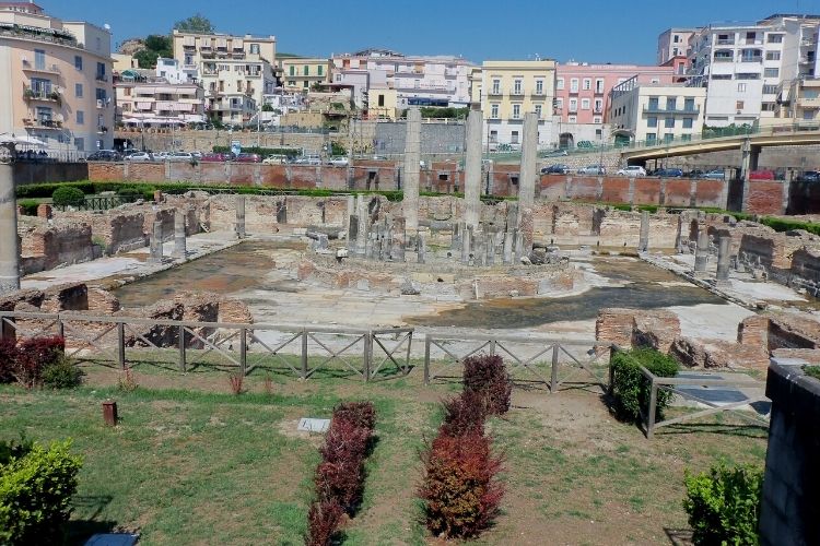 Puteoli was an important harbor in Roman times, importing grain and other goods from all over the world. While exporting goods such as blown glass, mosaics, wrought iron, and marble. The nearby Misenum port also housed the largest naval fleet in the ancient world.